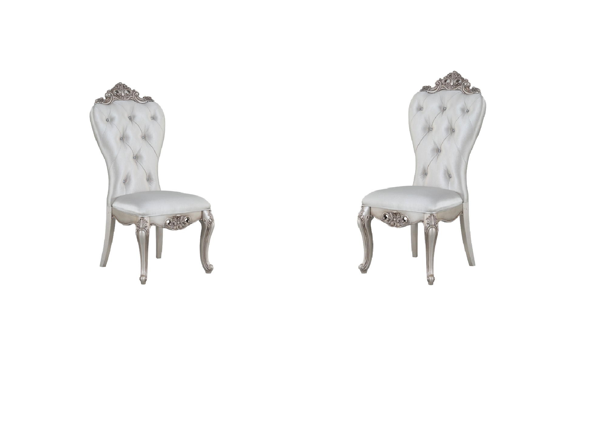 Out with the old and in with the new, this set of two cream and antiqued white upholstered fabric queen anne back dining side chairs can perfectly suit any dining table. This armless chair has a sleek silhouette making it ideal for seating around the table but can also double as an accent chair. The queen anne back gives this chair its unique style. Dining chairs are a great way to compliment your kitchen or dining room but can also be used in the foyer, hallway, or any room you might need extra seating. 42-inch h x 25-inch w x 22-inch d.