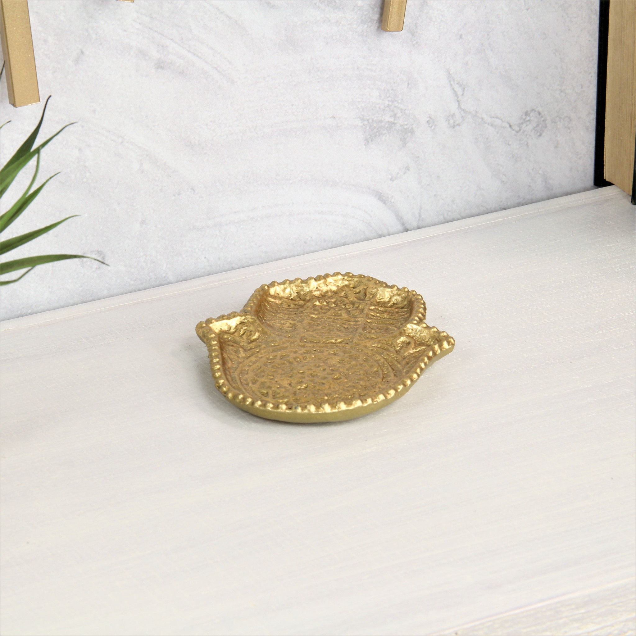 This 5" gold novelty metal handmade tray is perfect for serving, storing or displaying your favorites. This gorgeous novelty tray is crafted of metal Intended for decorative, non-food use only, it's the perfect decorative accent piece. 0.5" H x 4.75" W x...
