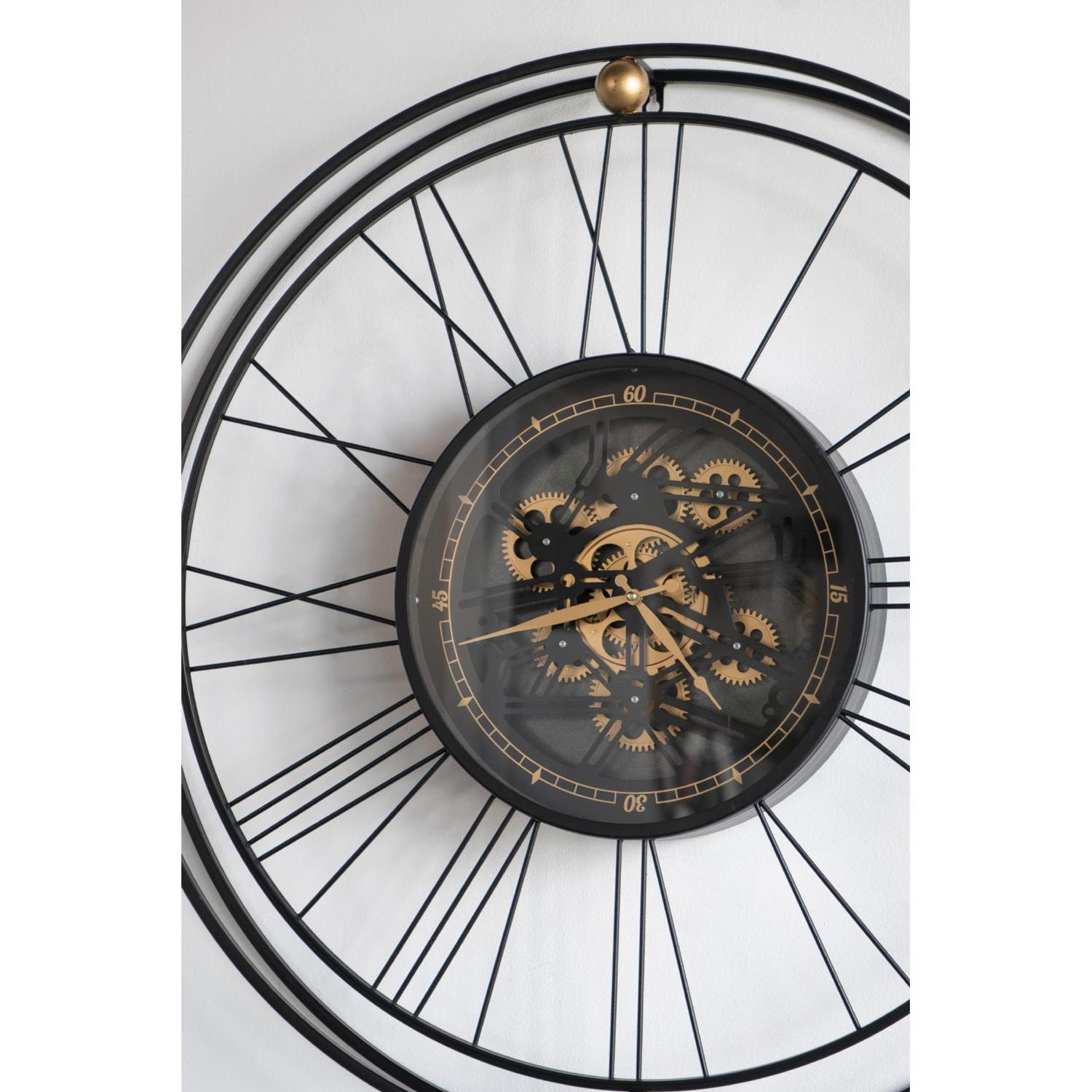 This 32-inch circle black and gold metal and glass analog exposed gear wall clock includes three moving hands on the face that move smoothly to indicate the hour, minute and seconds. The circle shape of this clock will bring a sense of wholeness to your h...