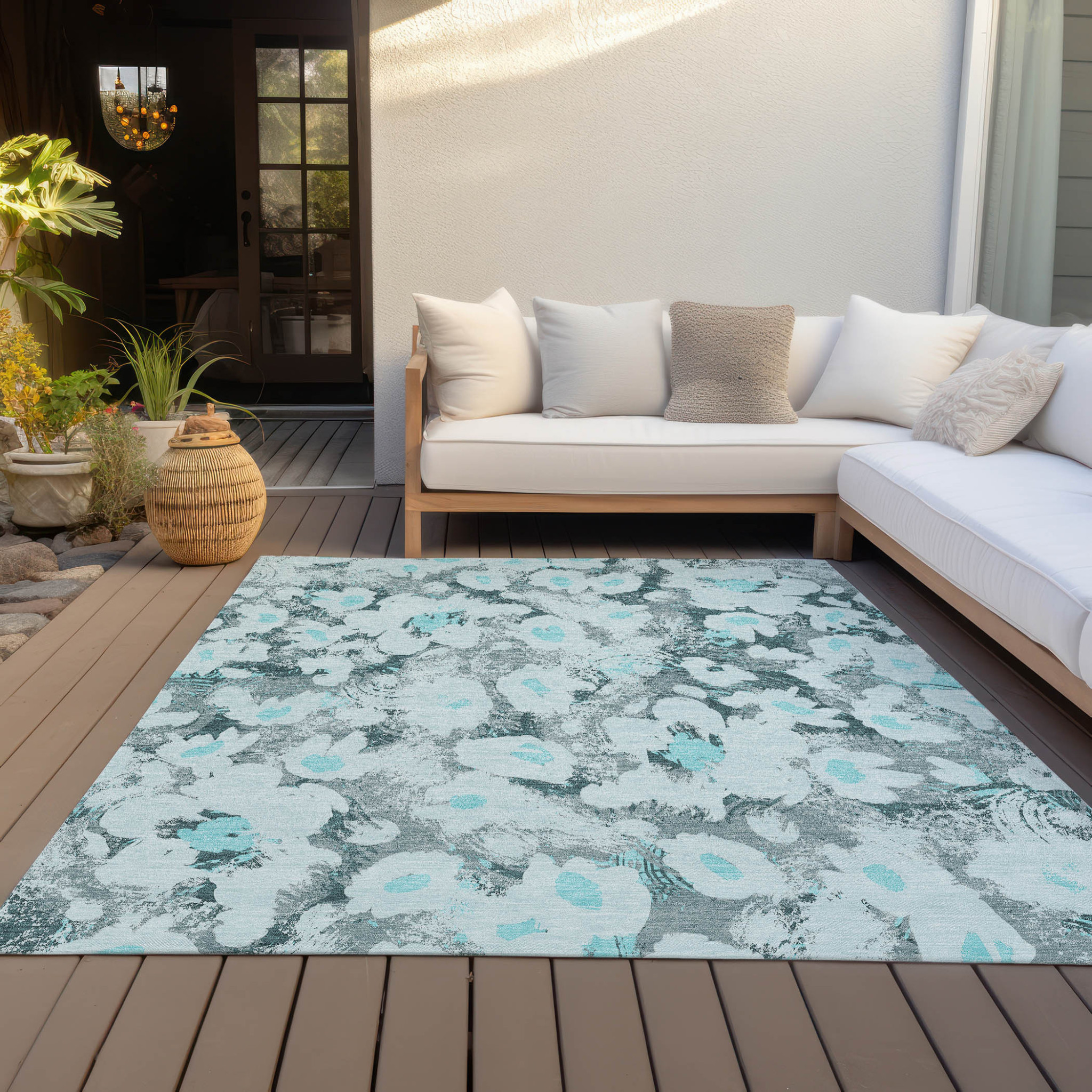 3' X 5' Teal Floral Washable Non Skid Indoor Outdoor Area Rug